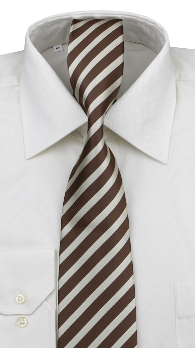 Pánska kravata ORSI - hnedo-smotanové farebné prevedenie, šírka zoštíhlená 8 cm, materiál 100% polyester, podšívka polyester.