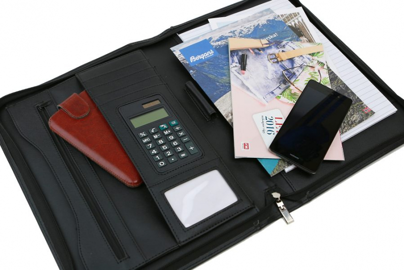 Vnútro s kalkulačkou, priečinkami na karty alebo vizitky a 3 priečinkami rôznych veľkostí.
