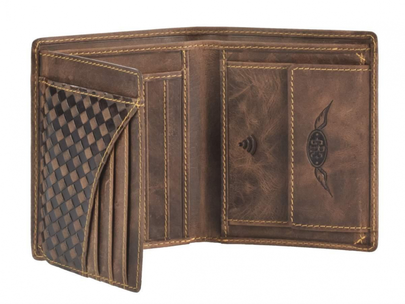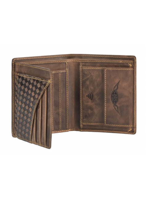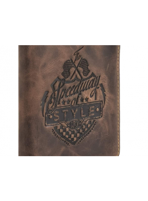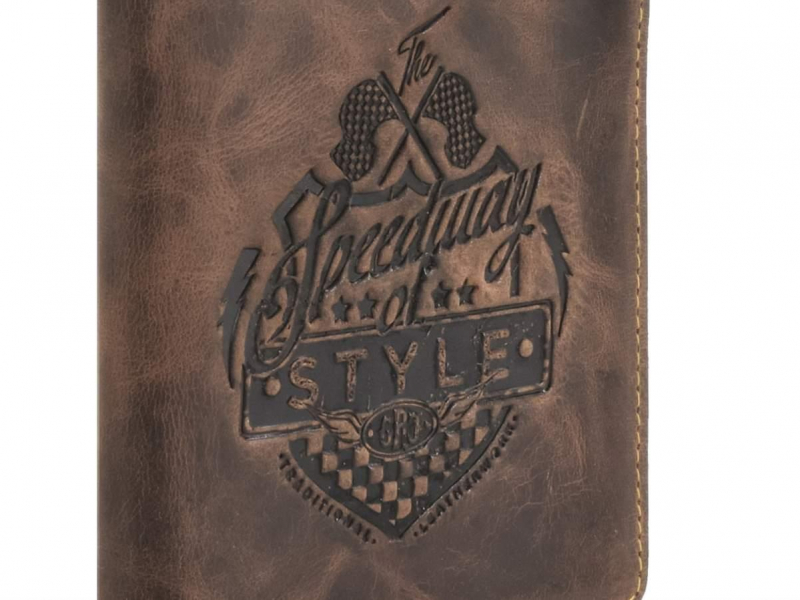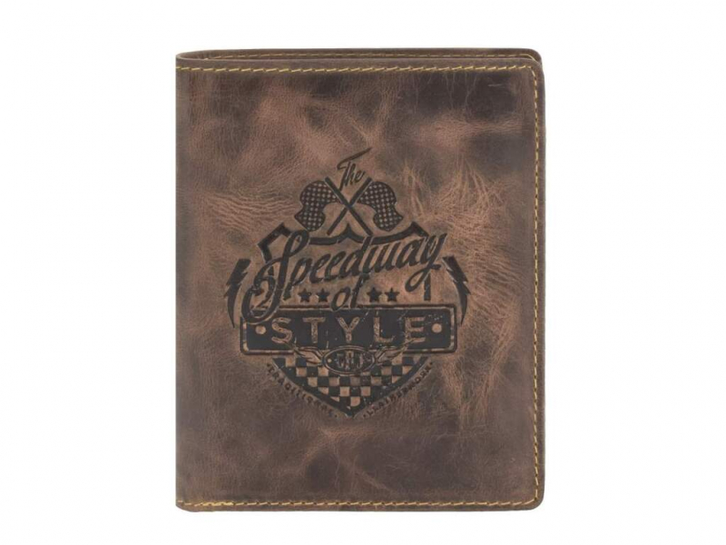 Priestranná pánska peňaženka v športovom štýle s výrazným embosovaným pretekárskym motívom a RFID ochranou kariet.