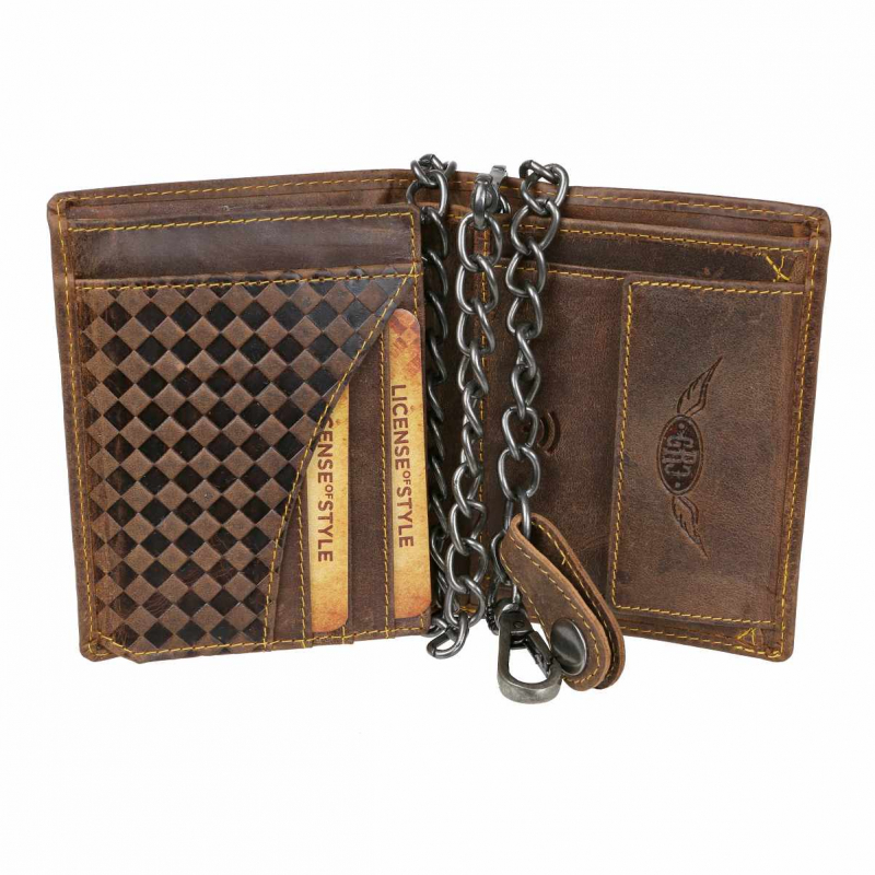 Priestranná pánska peňaženka v športovom štýle - s odnímateľnou retiazkou, výrazným vintage embosovaným pretekárskym motívom a RFID ochranou - VINTAGE model z pretekárskej kolekcie zn. GREENBURRY. Prémiová hladko brúsená koža a embosobvaná koža so vzorom vlajky.