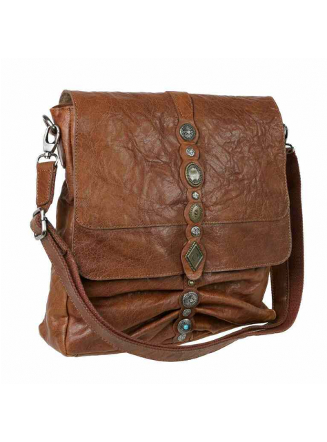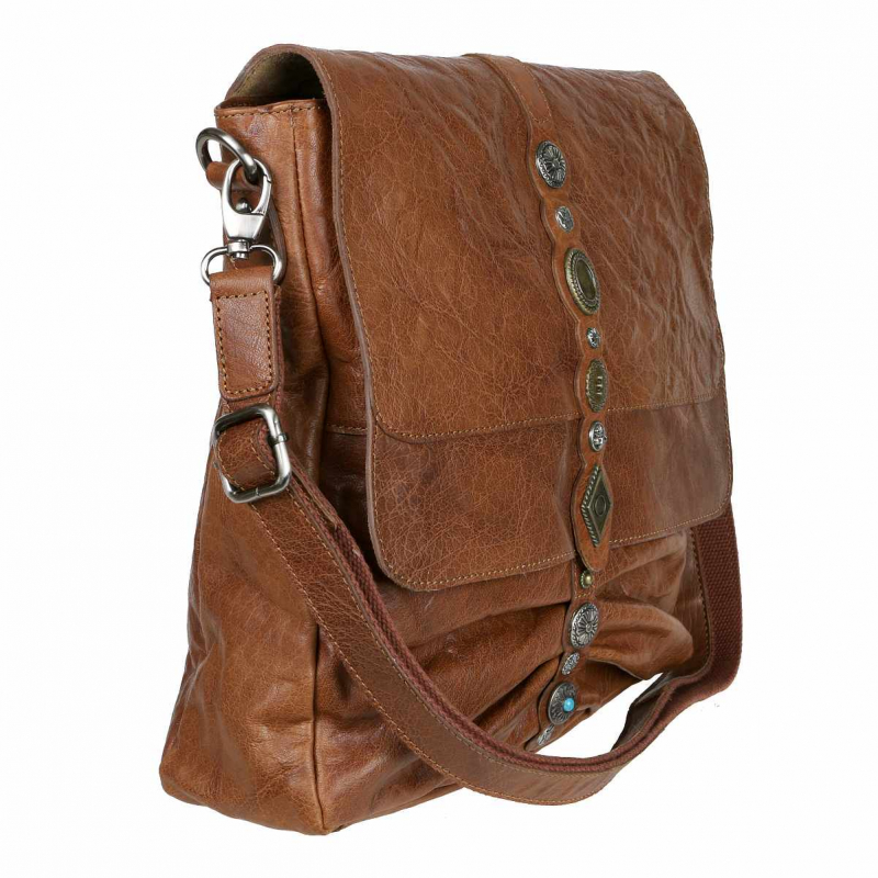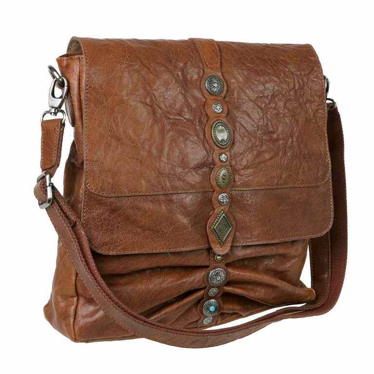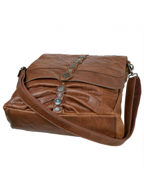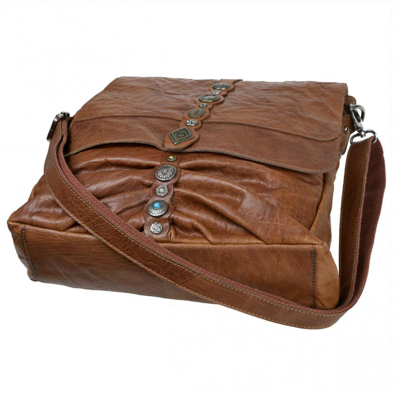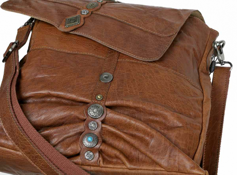 Chlopňa kabelky zdobená matnými kovovými aplikáciami v starožitnom štýle s ornamentálnym gravírovaním. Zvnútra tvarovaného poklopu brúsená koža. Vonkajší zadný a vnútorný priečinok s masívnym koženým bežcom. Súčasťou kabelky je odnímateľný a nastaviteľný popruh (šírka 2,5 cm, dĺžka - min. 80 - cca 145 cm).