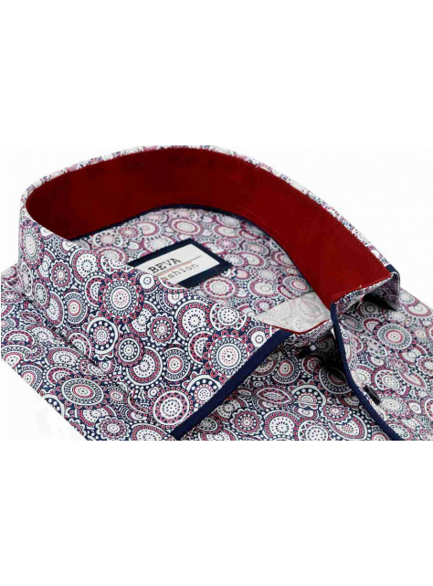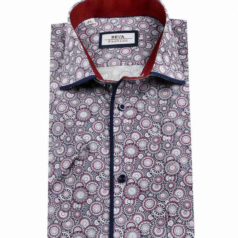 Trendová pánska košeľa z kolekcie BEVA FASHION s krátkym rukávom, menším golierom KENT z tkaniny s potlačou orientálnych mandál. Štýl športovej elegancie do obleku aj k džínsom.