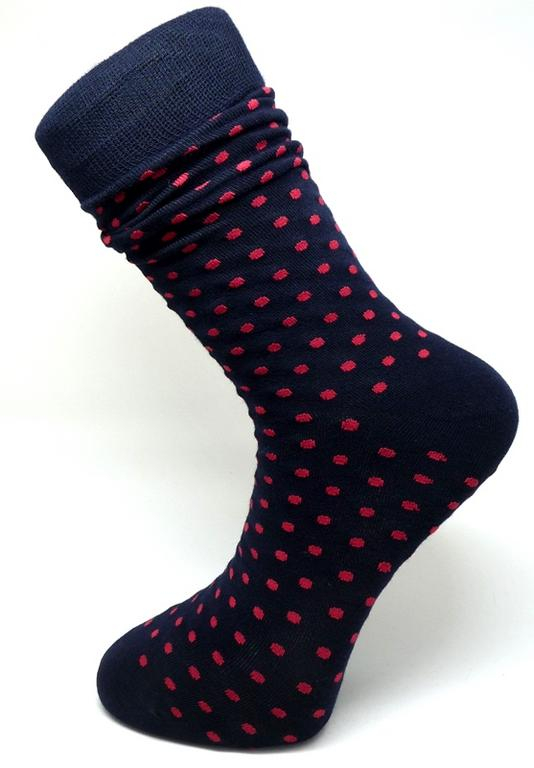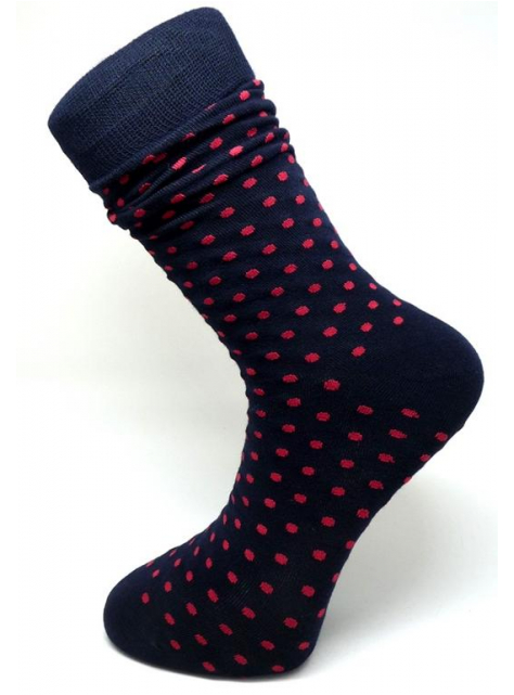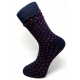 Moderné pánske ponožky ORSI tmavomodré s červenými bodkmi, hladké, elegantné do obleku. Prírodný materiál, hladká tkanina, elastický lem s jemným zverom - rovnomerne tkaný a rovnomerne rozložený tlak pre pohodlné nosenie.
