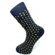 Moderné pánske ponožky ORSI tmavomodrej farby s výraznými žlltými bodkmi, hladké, elegantné do obleku. Prírodný materiál, hladká tkanina, elastický lem s jemným zverom - rovnomerne tkaný a rovnomerne rozložený tlak pre pohodlné nosenie.