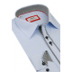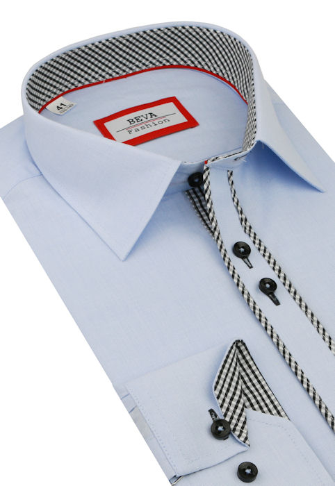 Ponúkame Vám elegantnú pánsku oblekovú košeľu v módnom dizajne s decentným lemovaním a kontrastmi. Príjemná bledomodrá košeľa s bielo-čiernym károvaným lemovaním.