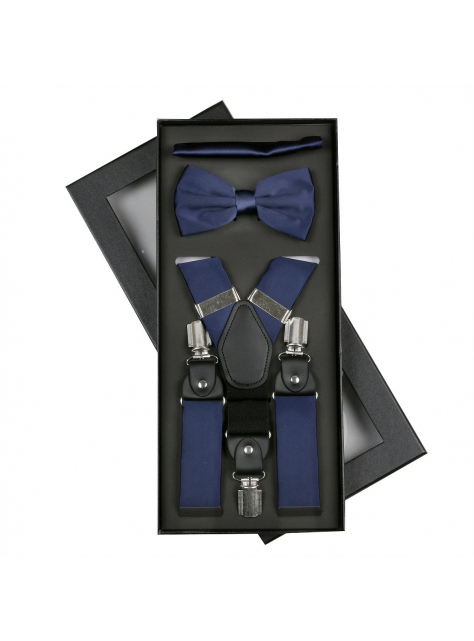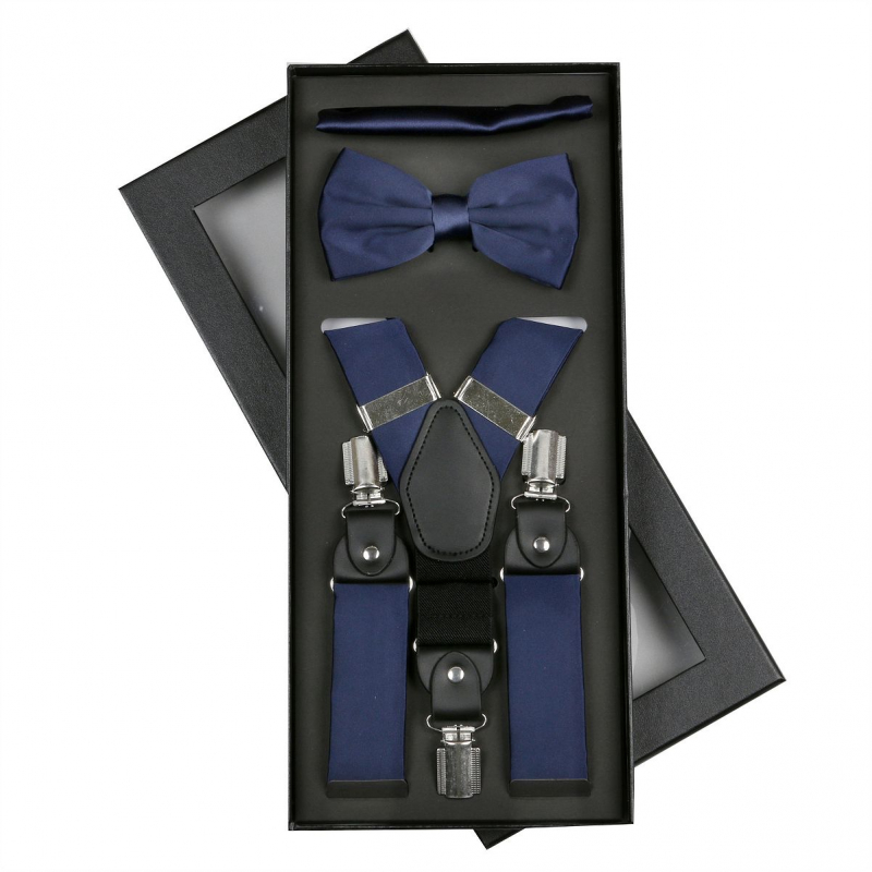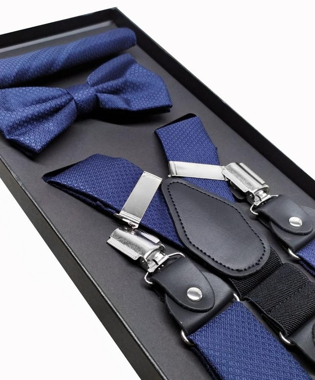 Tmavomodrý 3-dielny set - Traky, motýlik, vreckovka