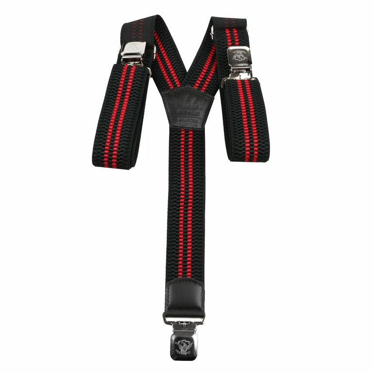 Traky čierne s červenými prúžkami a s gravírovanými kovovými klipmi - vhodné ako traky k nohaviciam, športové, voľnočasové (do džínsov), pracovné.