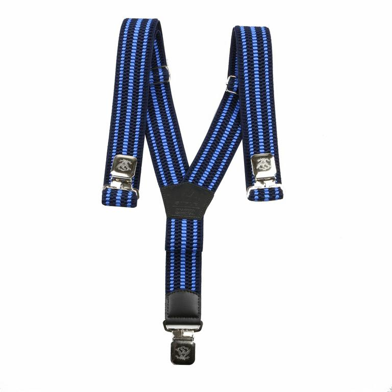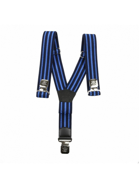 Traky tmavomodré s modrými prúžkami v odtieni parížska modrá a s gravírovanými kovovými klipmi - vhodné ako traky k nohaviciam, športové, voľnočasové (do džínsov), pracovné.
