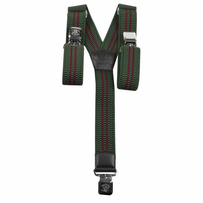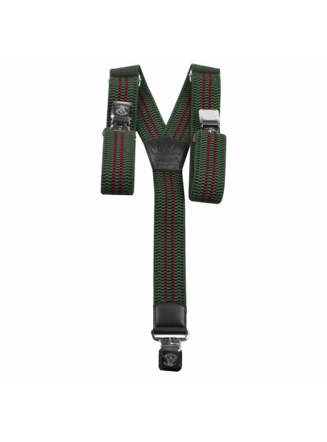Traky zelené olivové s červenými prúžkami a s gravírovanými kovovými klipmi - vhodné ako traky k nohaviciam, športové, voľnočasové (do džínsov), pracovné.