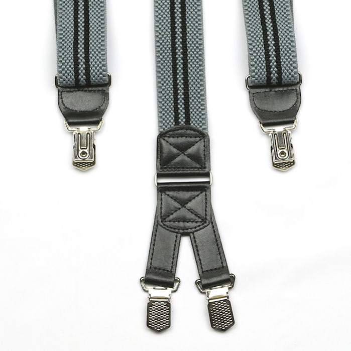 Materiál (zloženie) - čierna koža, tkaná elastická guma v šedej farbe v tkanej zrnitej štruktúre, kovové klipsy - kov strieborný