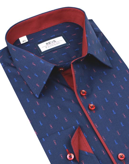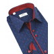 Ponúkame Vám pánsku slim košeľu v módnom štýle. Tmavomodrá košeľa s potlačou vzoru a kontrastným lemovaním a podšitím je vhodná ako košeľa na rôzne príležitosti aj na bežné nosenie. Košeľa v slim strihu na výšku postavy 176 - 182 cm.