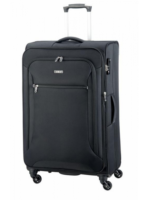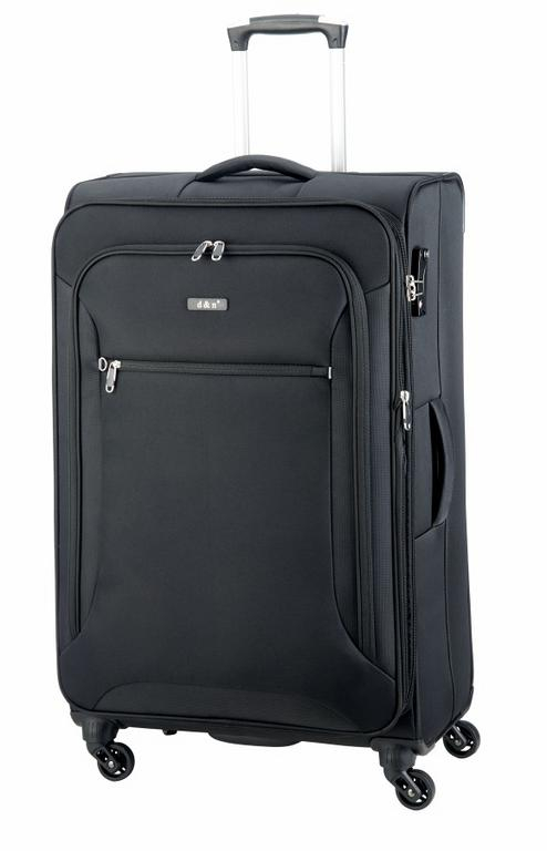 Veľký cestovný kufor D&N v čiernej farbe. Extra ľahký kufor z nepremokavého nylonu 200D a 500D, kufor je jednoducho umývateľný. Kufor je vybavený 4 kolieskami z tvrdeného plastu- otáčavé o 360°. Kufor je opatrený dvojdielnym zipsom so zapínaním do TSA zámku. Na boku a vrchu kufra sa nachádza textilná rúčka pre lepšie prenášanie, taktiež je kufor vybavený aj výsuvným teleskopickým držiakom.