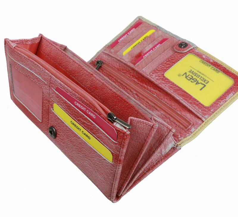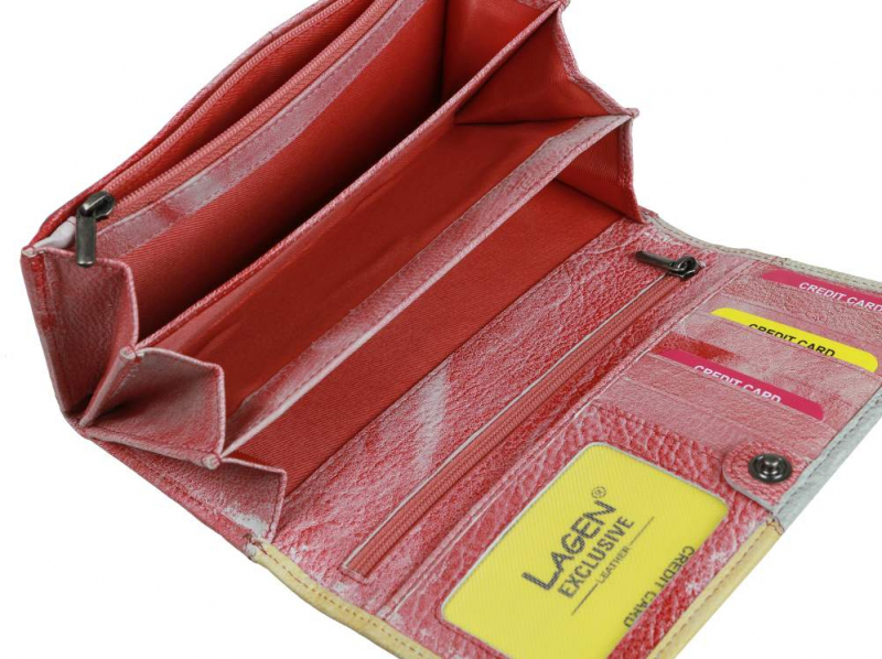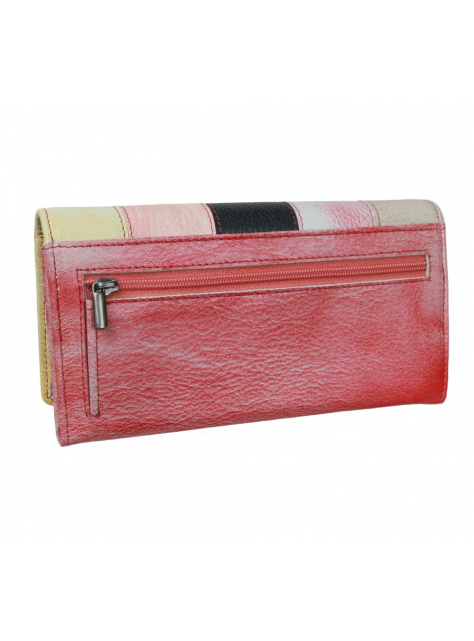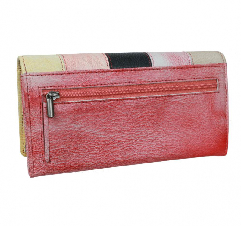 Dámska kožená peňaženka - obľúbený model veľkého typu s veľkými vnútornými priehradkami, skrytým priečinkom a priestranným mincovníkom. Lícna strana s prešívanými ozdobnými pásmi. Hladká zmäkčená a na dotyk príjemná koža v pevnej úprave. Kvalitné, pevné a precízne spracovanie. Zapínanie na kovový patent, mincovník na zips. Vhodná aj pre starší typ dokladov.