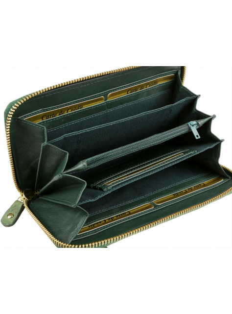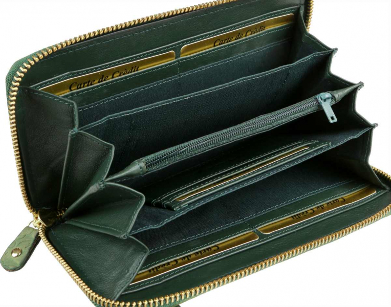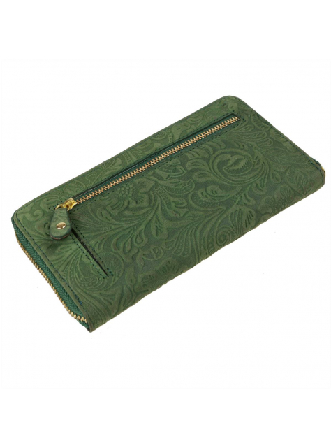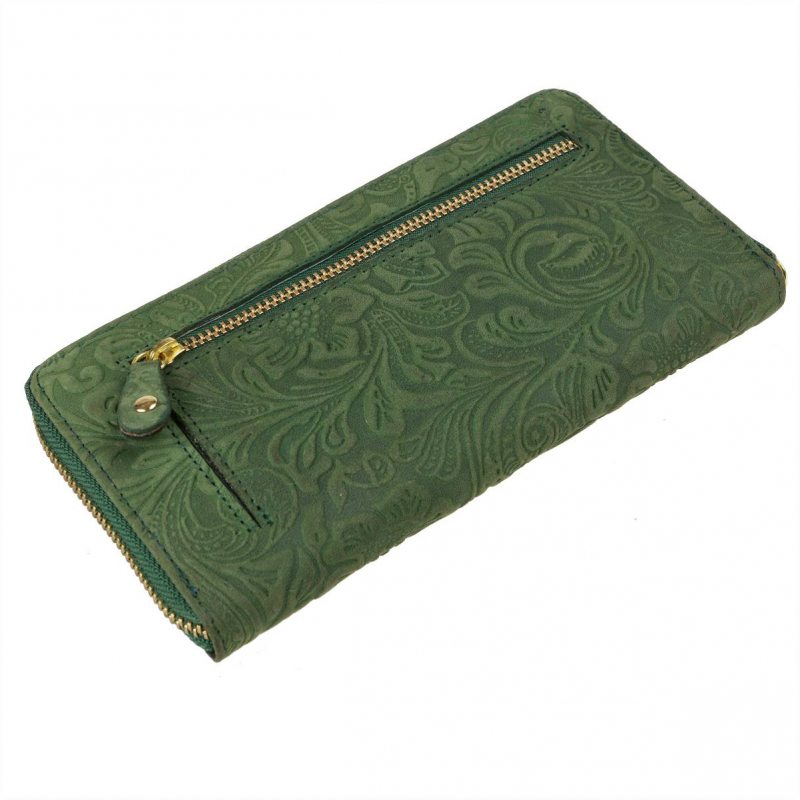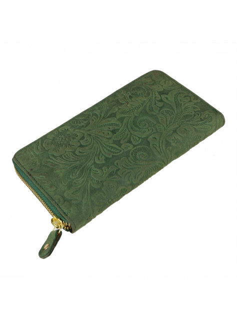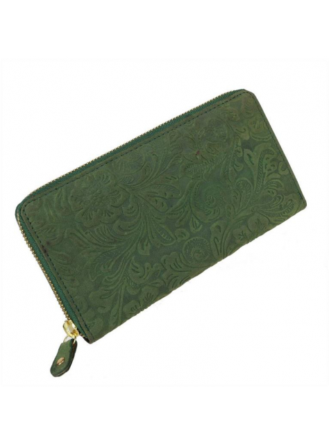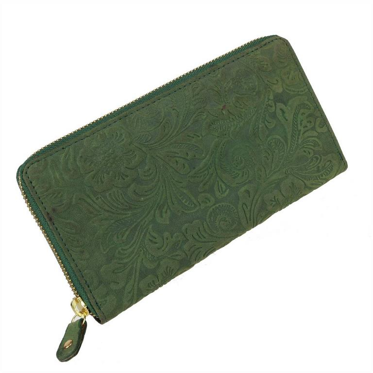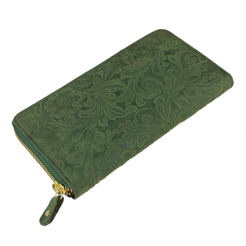 Elegantná dámska peňaženka MERCUCIO zelenej farby. Listová peňaženka s elegantnou brúsenou potlačou kvetov. Vejárovité otváranie, uzatváranie zipsom v zlatej farbe.